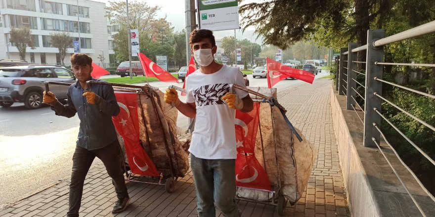 Bursa'da geçimlerini çek çek arabayla karton toplayarak sağlayan iki gencin Türk Bayraklarıyla süslediği arabaları ilgi odağı oldu. Cumhuriyetin 97.yıldönümü etkinliklerine kartoncu çocukların bu görüntüsü damgasını vurdu