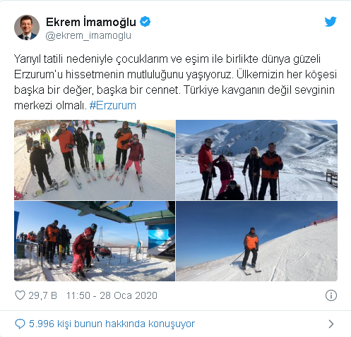“Yarıyıl tatili nedeniyle çocuklarım ve eşim ile birlikte dünya güzeli Erzurum'u hissetmenin mutluluğunu yaşıyoruz. Ülkemizin her köşesi başka bir değer, başka bir cennet. Türkiye kavganın değil sevginin merkezi olmalı. #Erzurum”