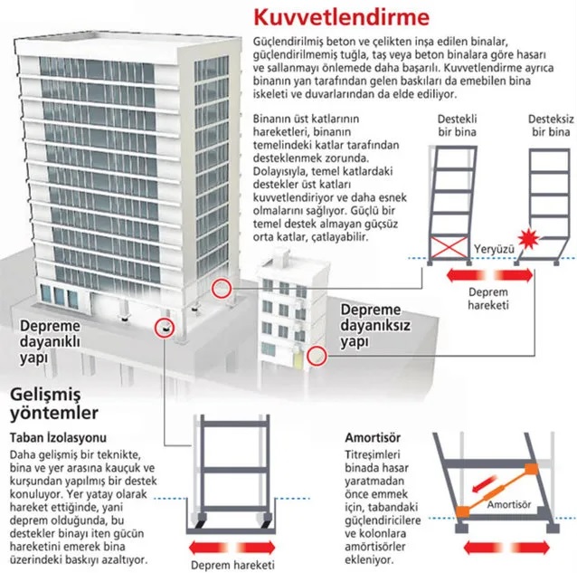 Evlerin ve binaların yapımından önceki aşamada yani temel atılırken kullanılan yalıtım ve binadaki sistem evleri depreme dayanıklı hale getiriyor. Bu sistem sayesinde deprem anında binalar kırılmak yerine esnemektedir. Japonya'da mühendisler, duvarların içindeki boşluklara metal plakalar yerleştirerek tüm binanın aynı anda hareket etmesini sağlar. Bu esneklik binanın çökmesini veya kırılmasını önlemek için yapılmıştır. Ülkedeki çok büyük binalar ve gökdelenler bile bu sistemle ayakta kalıyor. Kullanılan sistem 3 metreye kadar mesafe ve sağa, sola veya önden arkaya bir esneme payı sunar. Bina temelinde amortisör kullanımı, hareket sırasında esneklik dikkate alındığında titreşimi nötralize eder.